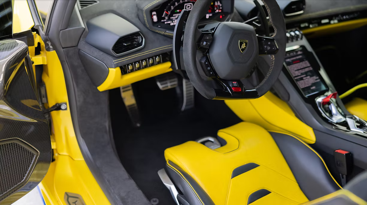 Inside the Lamborghini Huracán STO, the cabin is stripped down and performance-driven. Carbon fiber dominates the interior, paired with Alcantara trim and lightweight racing seats. The driver-focused cockpit places all controls within easy reach, creating a true motorsport feel.